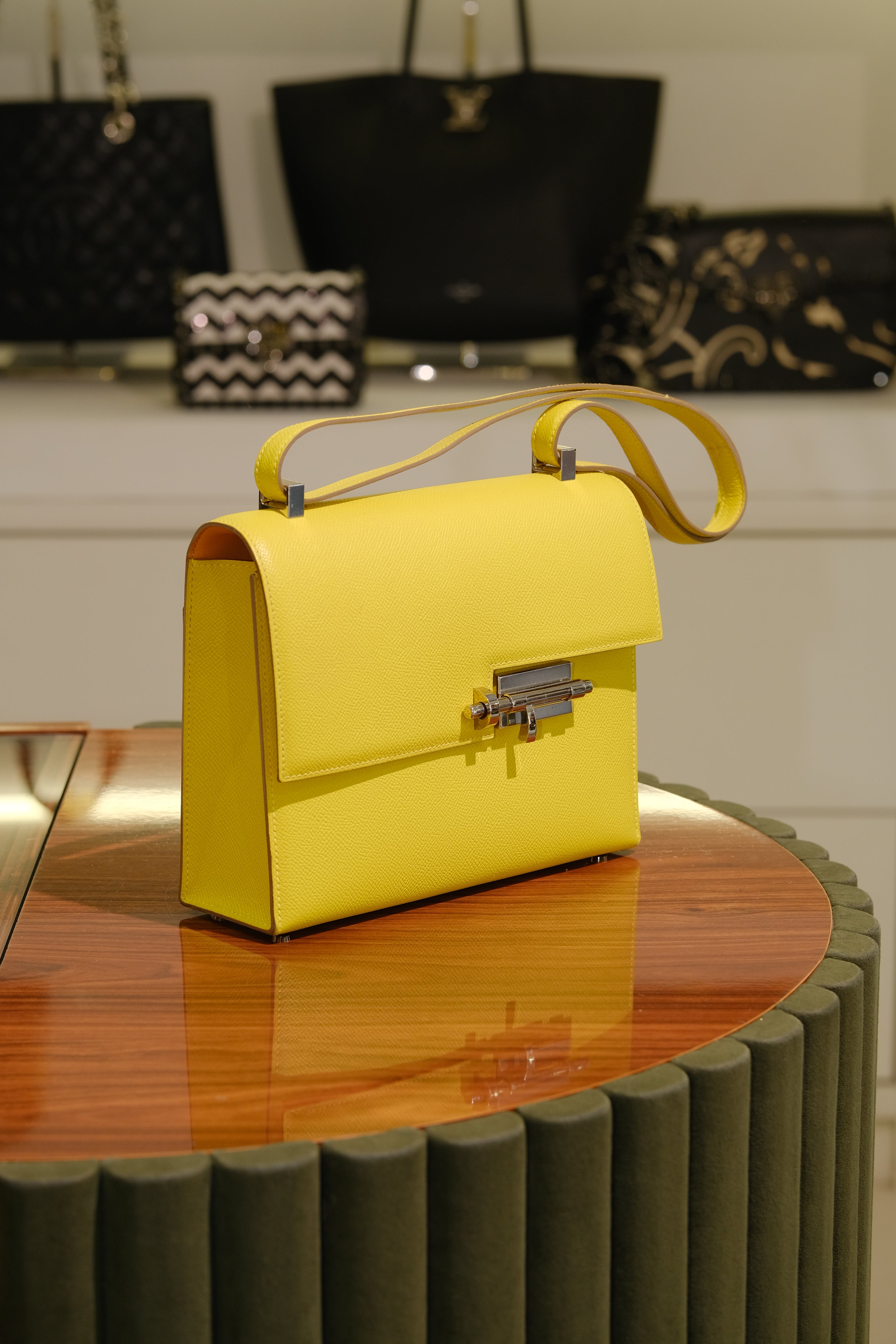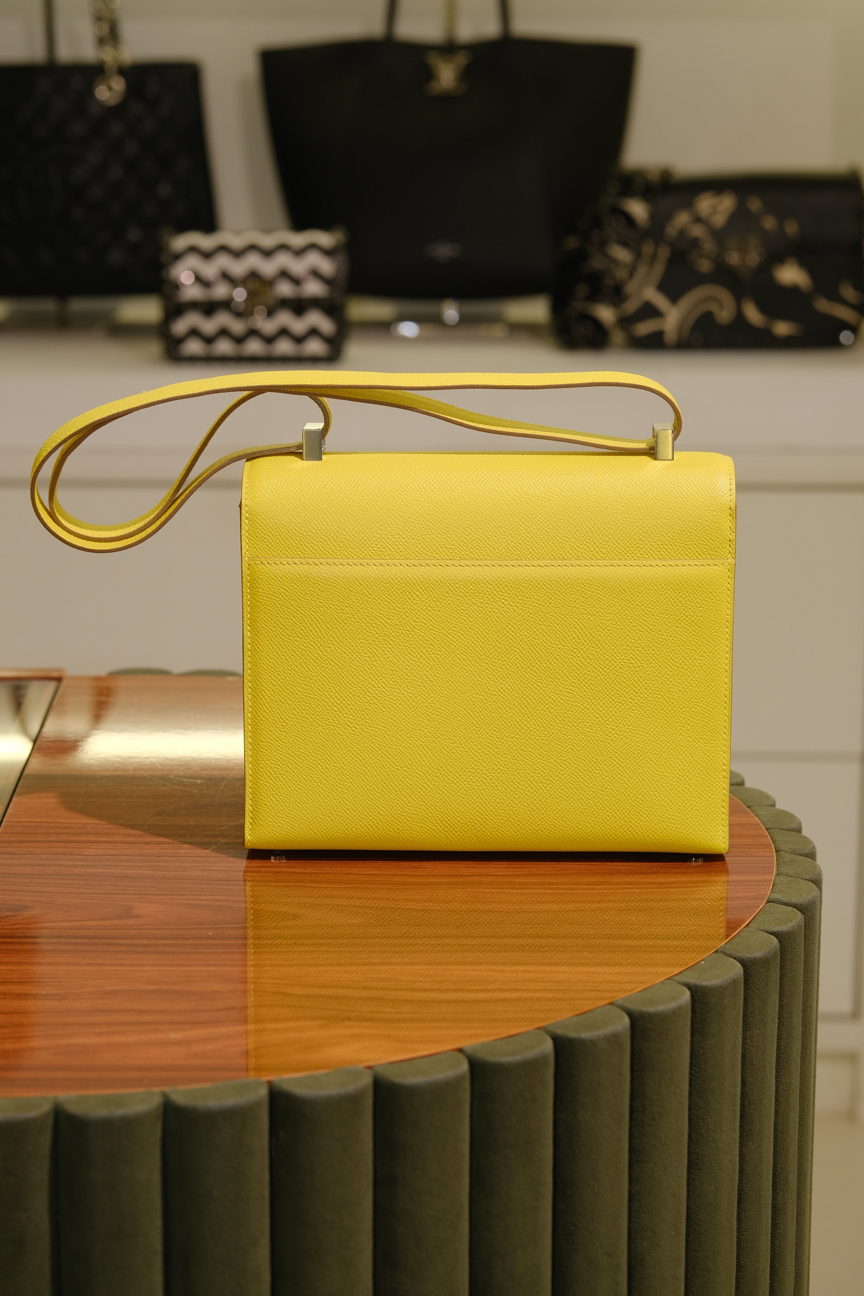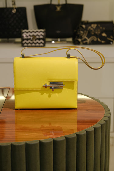 Bolsa Hermès Verrou, em couro na cor amarela, compartimento com bolso, ferragem em prata, alça longa ajustável e aba frontal com fecho de encaixe.