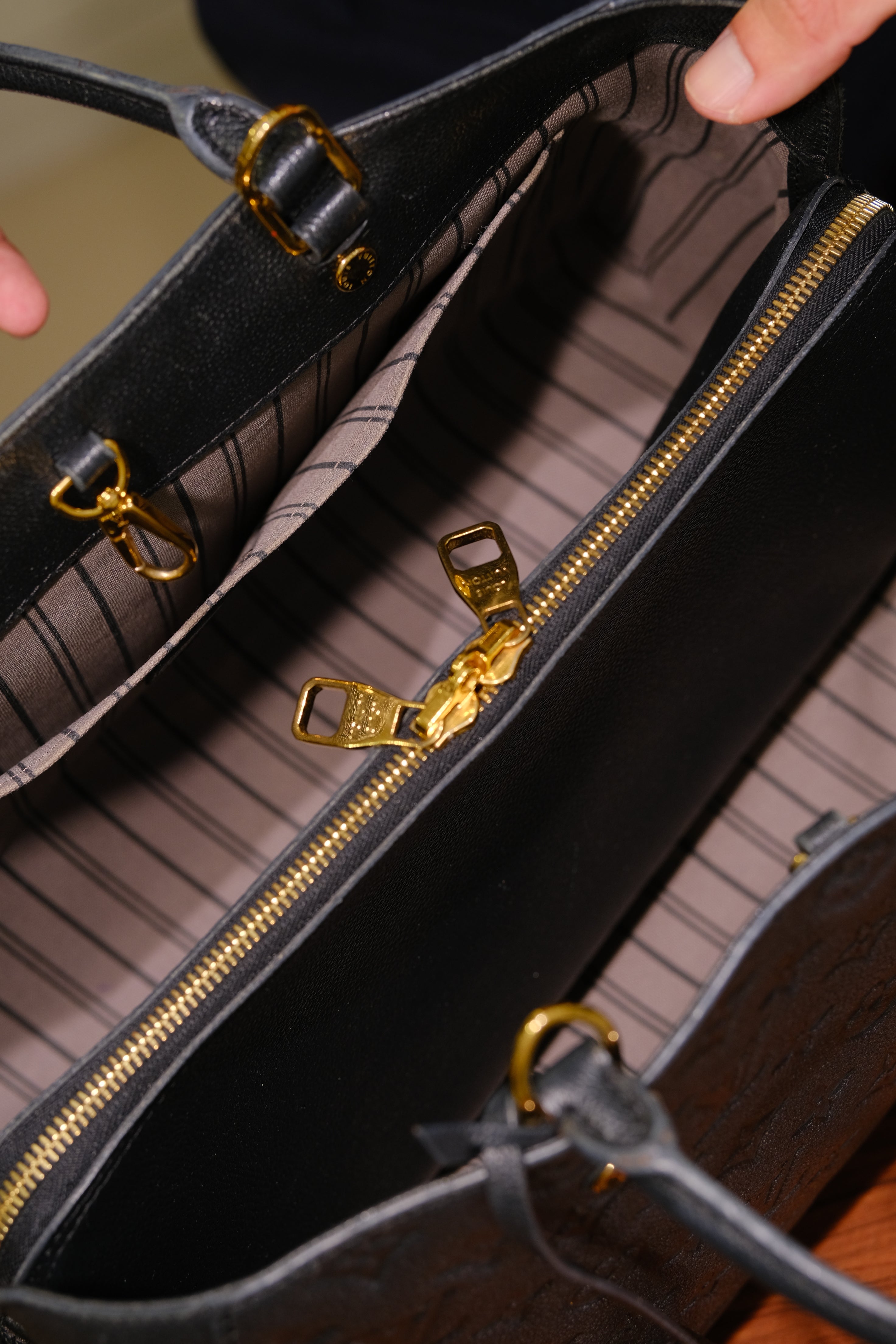 Bolsa Louis Vuitton Montaigne, em couro Calfskin na cor preto, compartimento com divisória e bolso fechado por zíper, alça dupla de mão e alça longa ajustável, ferragem em dourado e fecho por mosquetão.