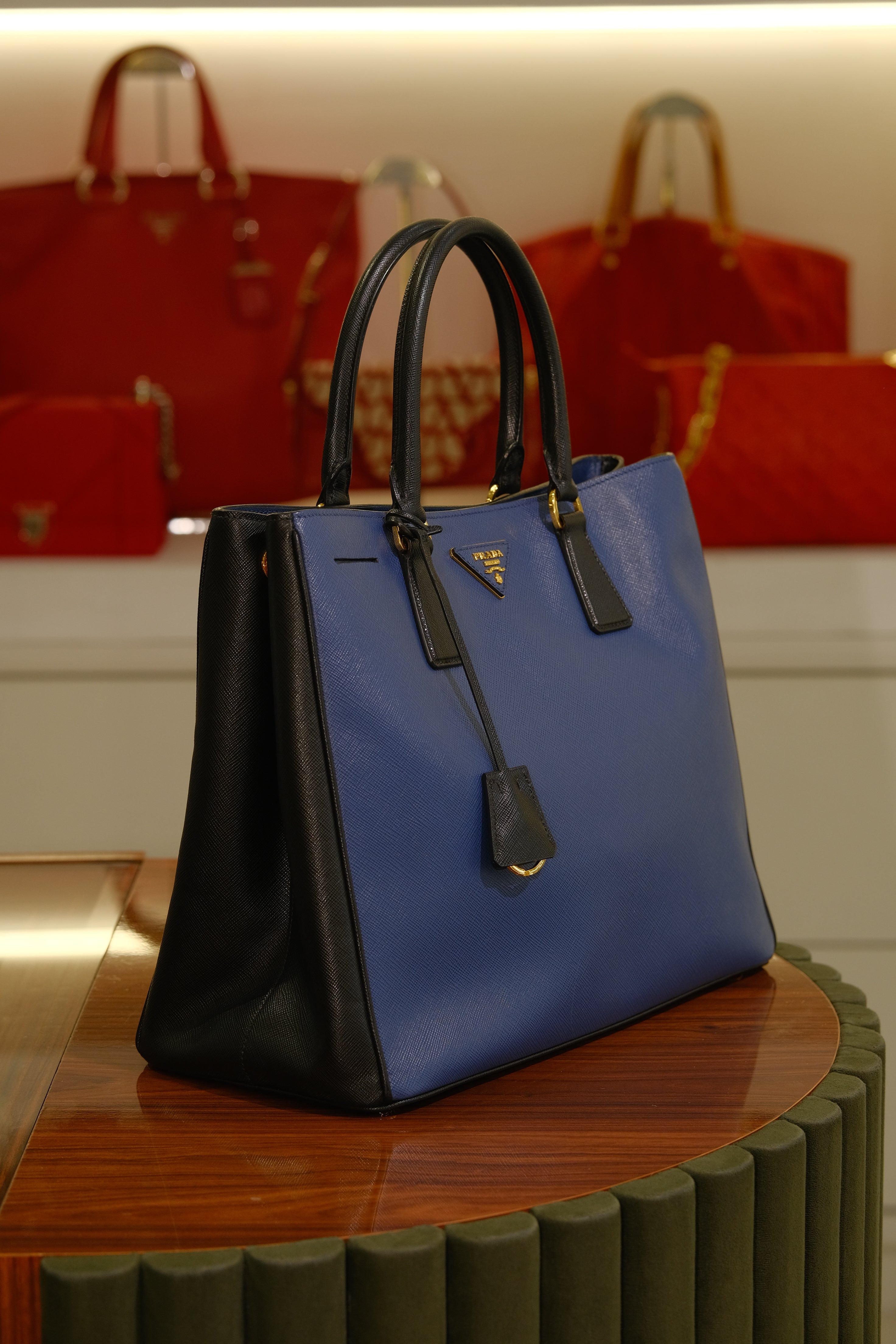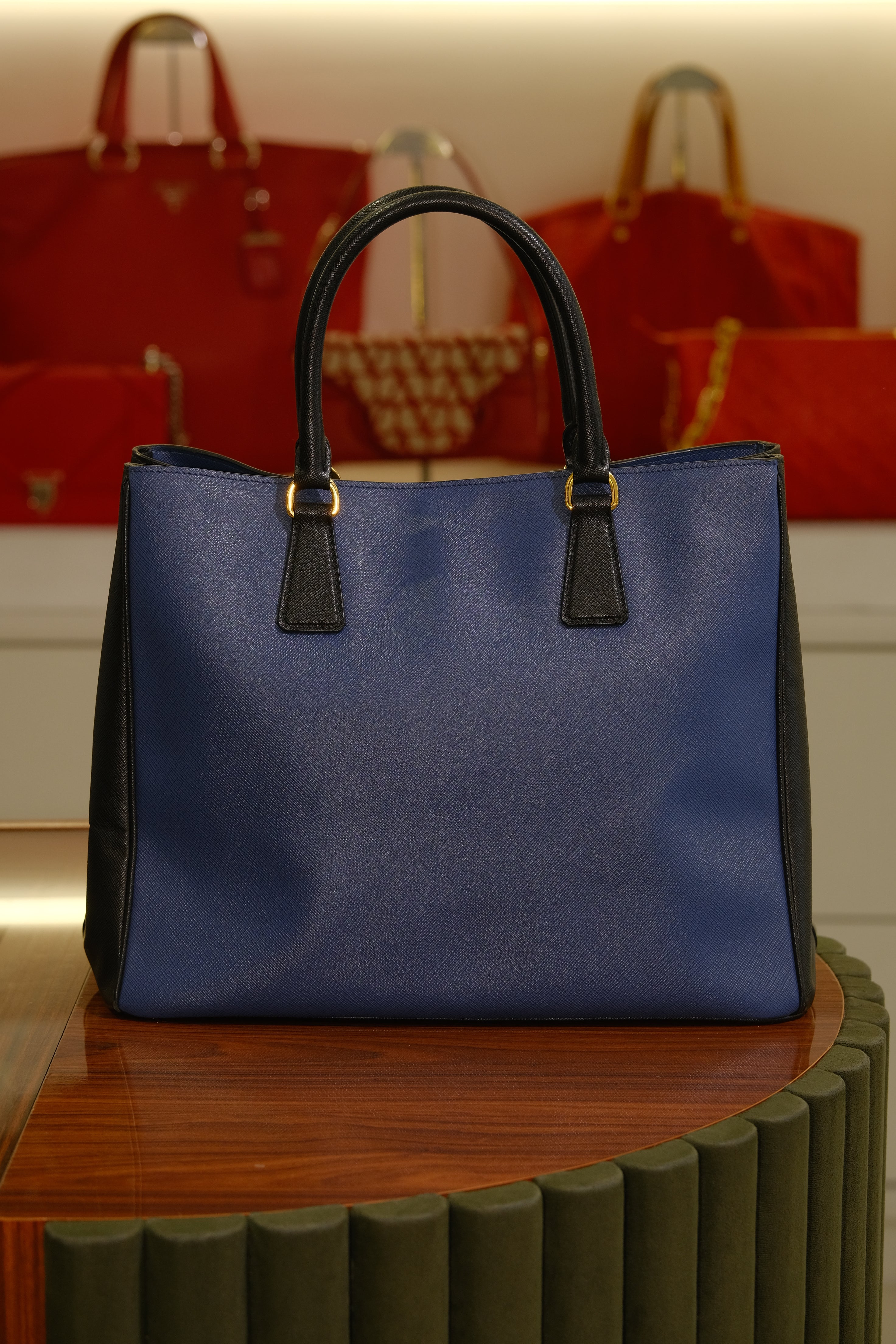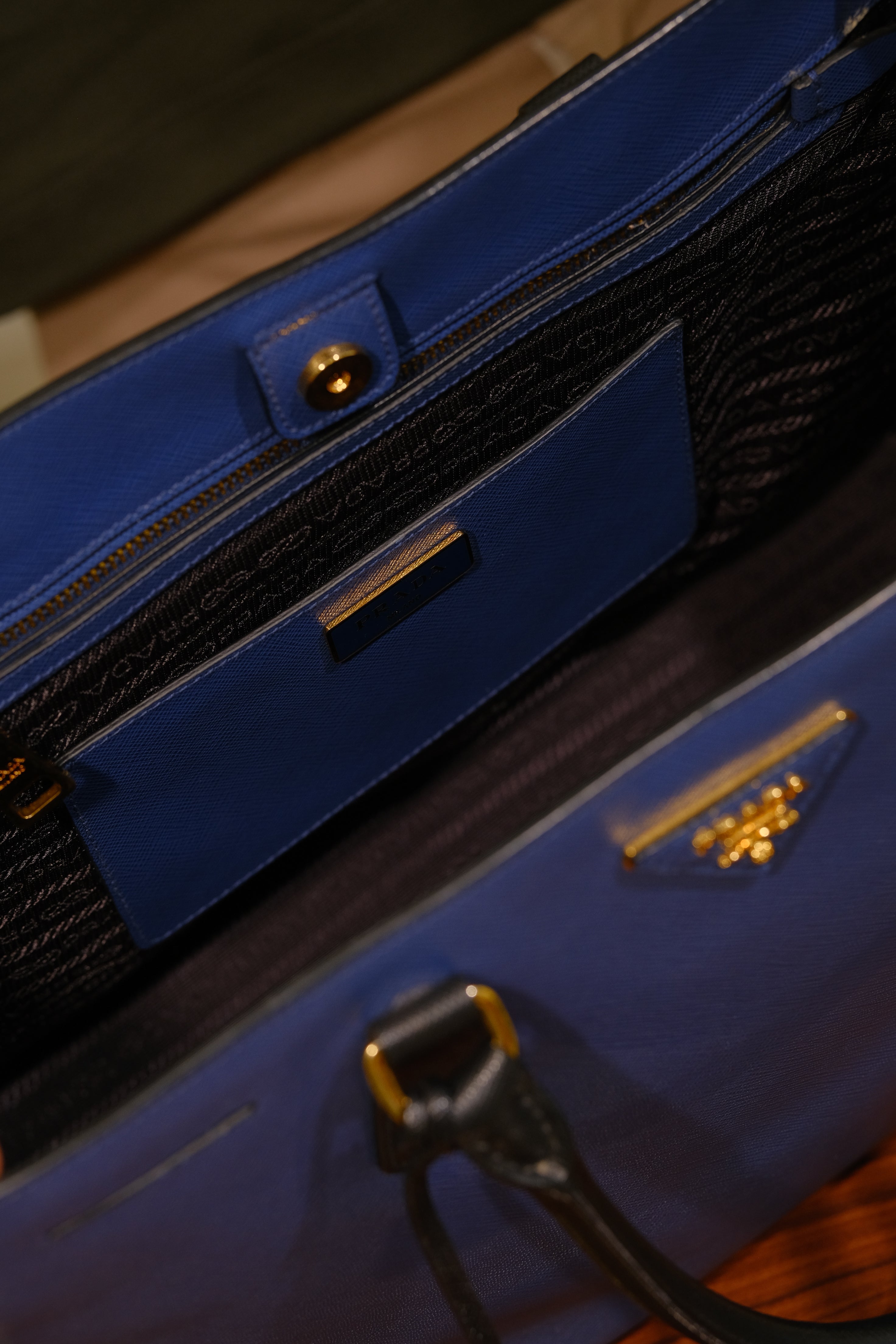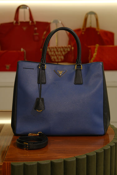 Bolsa Prada Saffiano, em couro saffiano na cor azul e preta, compartimento único com bolso fechado por zíper, alça dupla de mão e alça longa ajustável, ferragem em dourado e fecho superior com botão de pressão.
