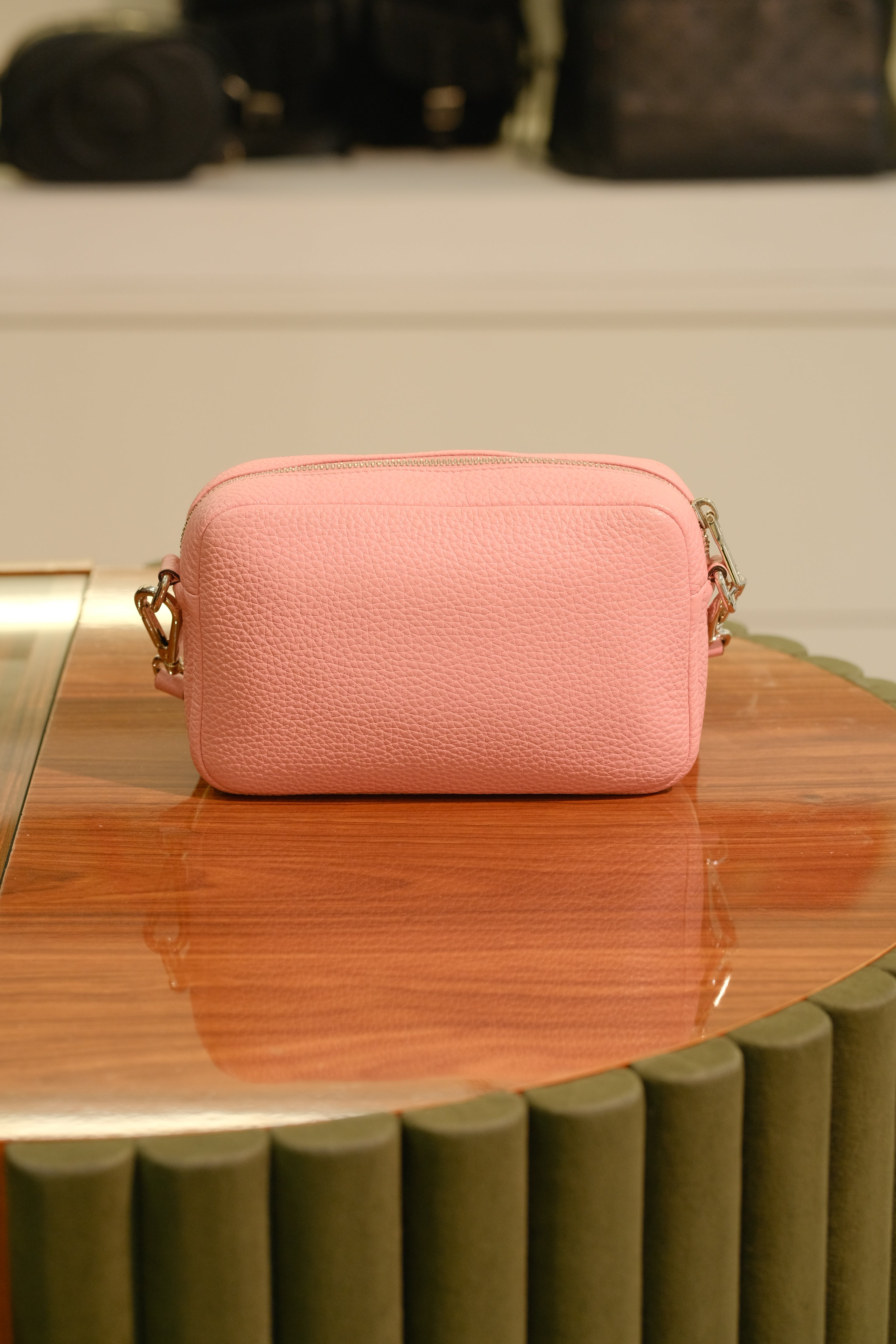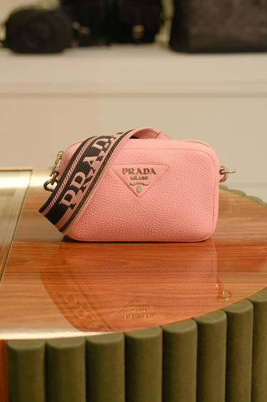 Bolsa Prada Camera Bag, em couro na cor rosa, compartimento único com bolso interno aberto, alça longa ajustável, ferragem em prata e zíper na parte superior.