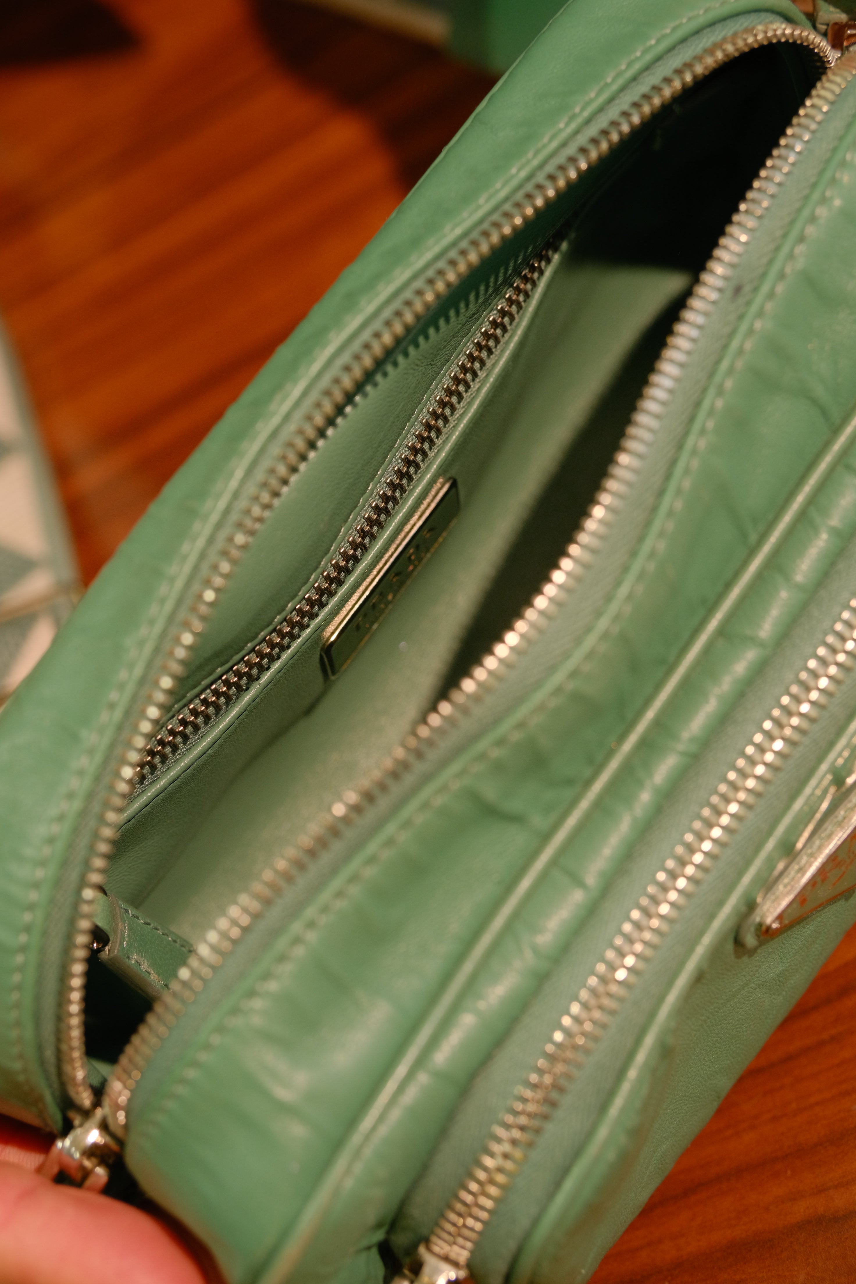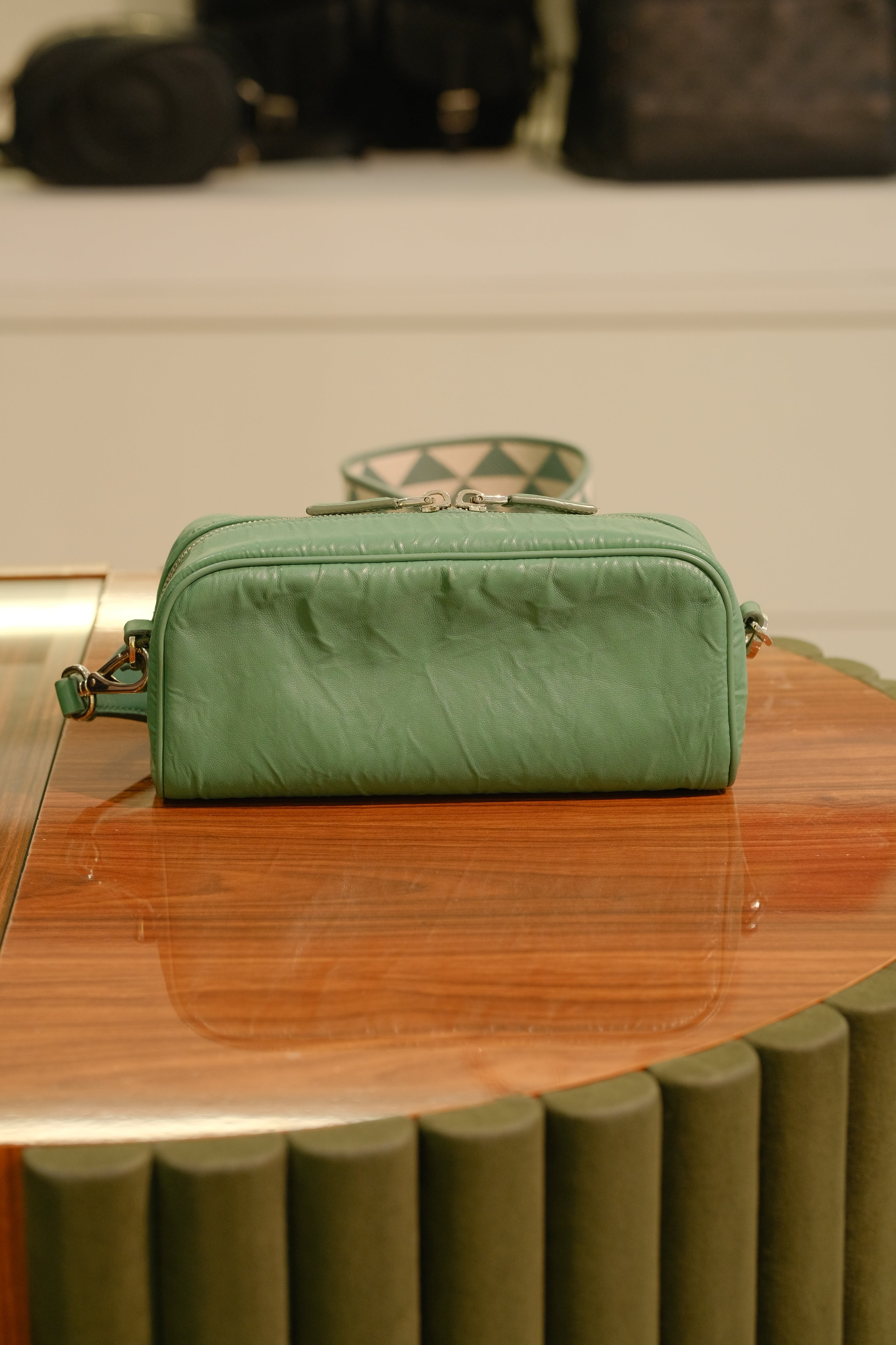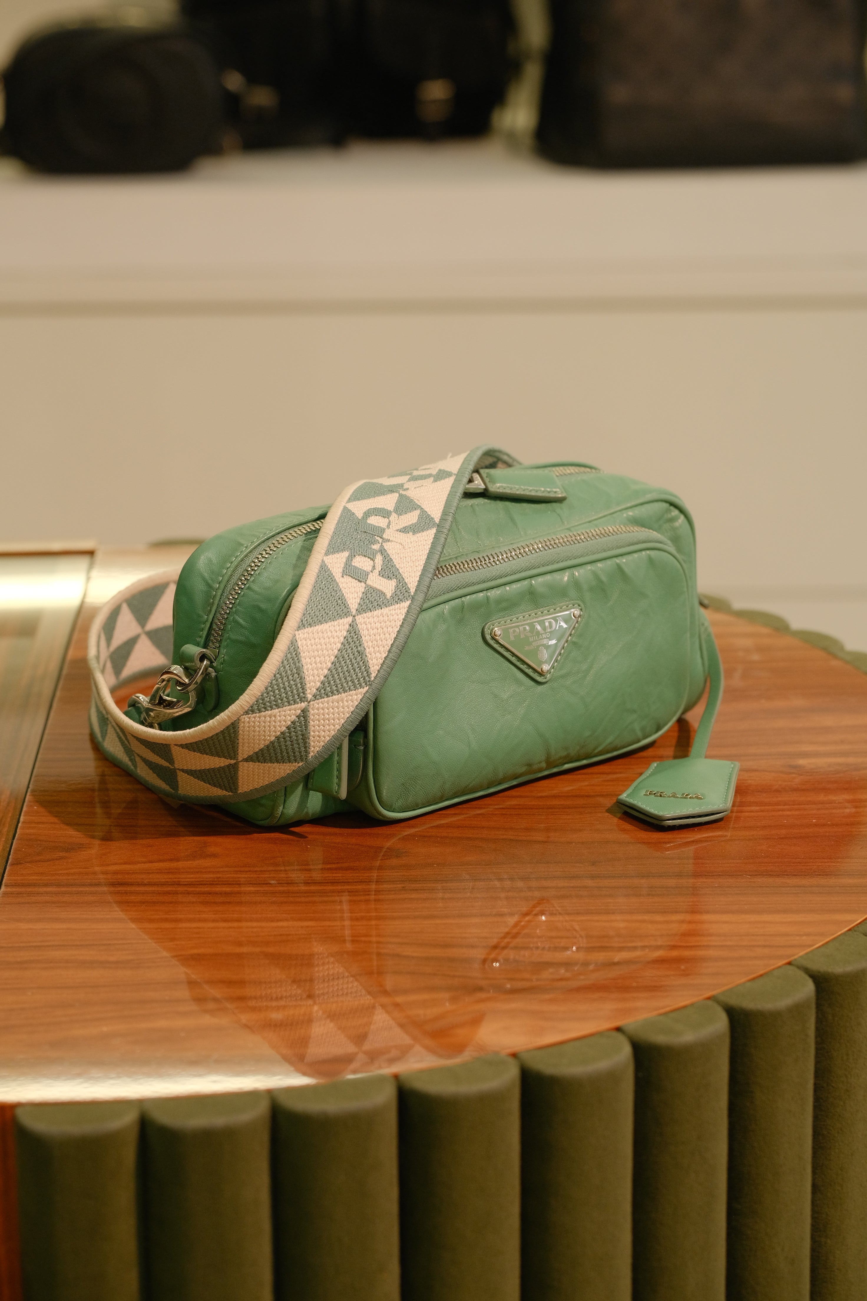Bolsa Prada Nappa Antique, em nappa na cor verde, compartimento único e bolso interno fechado por zíper, bolso na parte frontal fechado por zíper, alça longa ajustável e ferragem em prata.