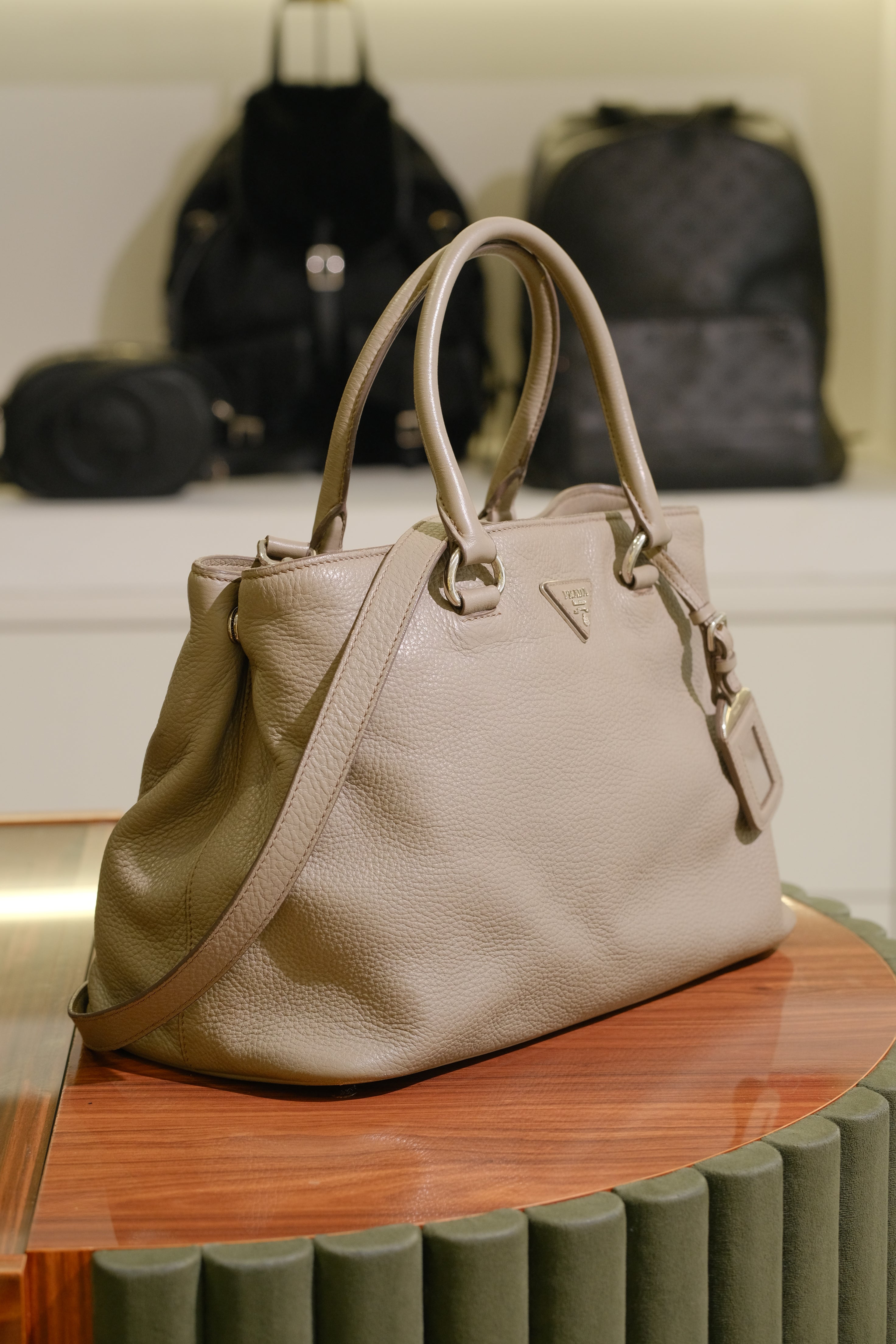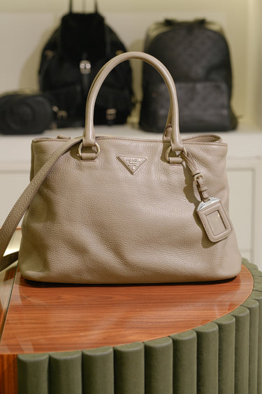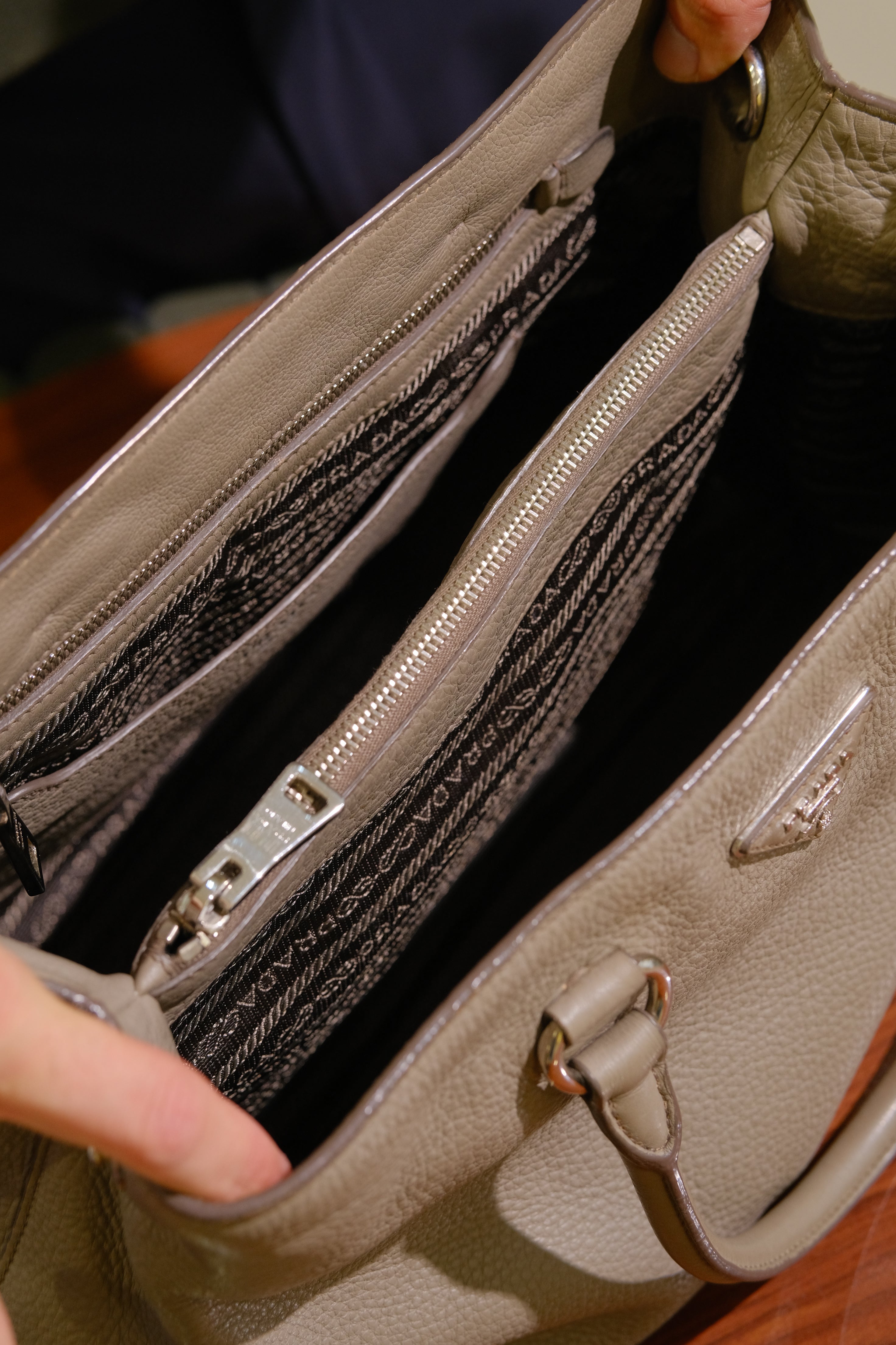 Bolsa Prada Vitello Daino, em couro na cor cinza, compartimento com divisória, bolso fechado por zíper e bolso aberto, alça dupla de mão e alça longa ajustável e ferragem na cor prata.