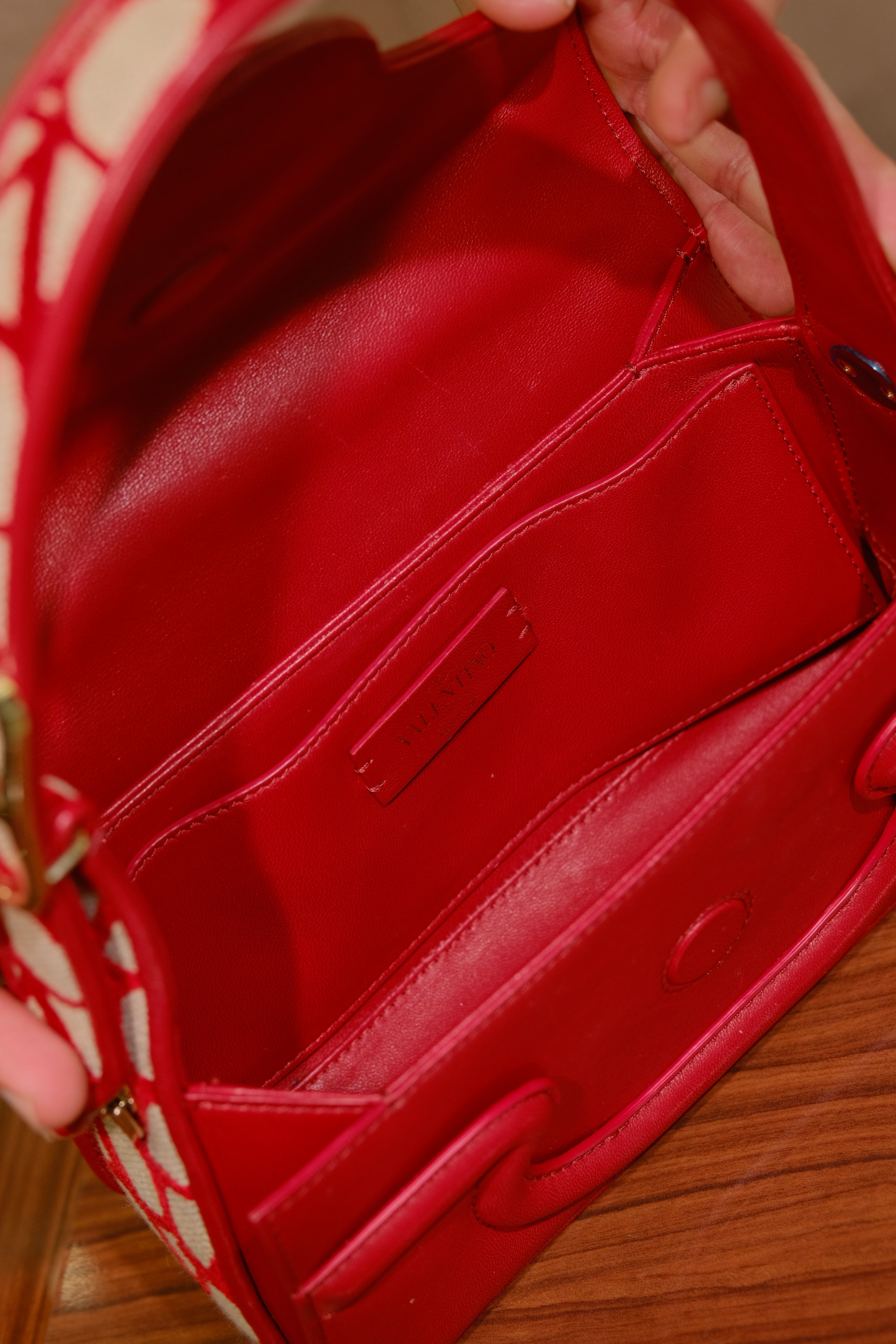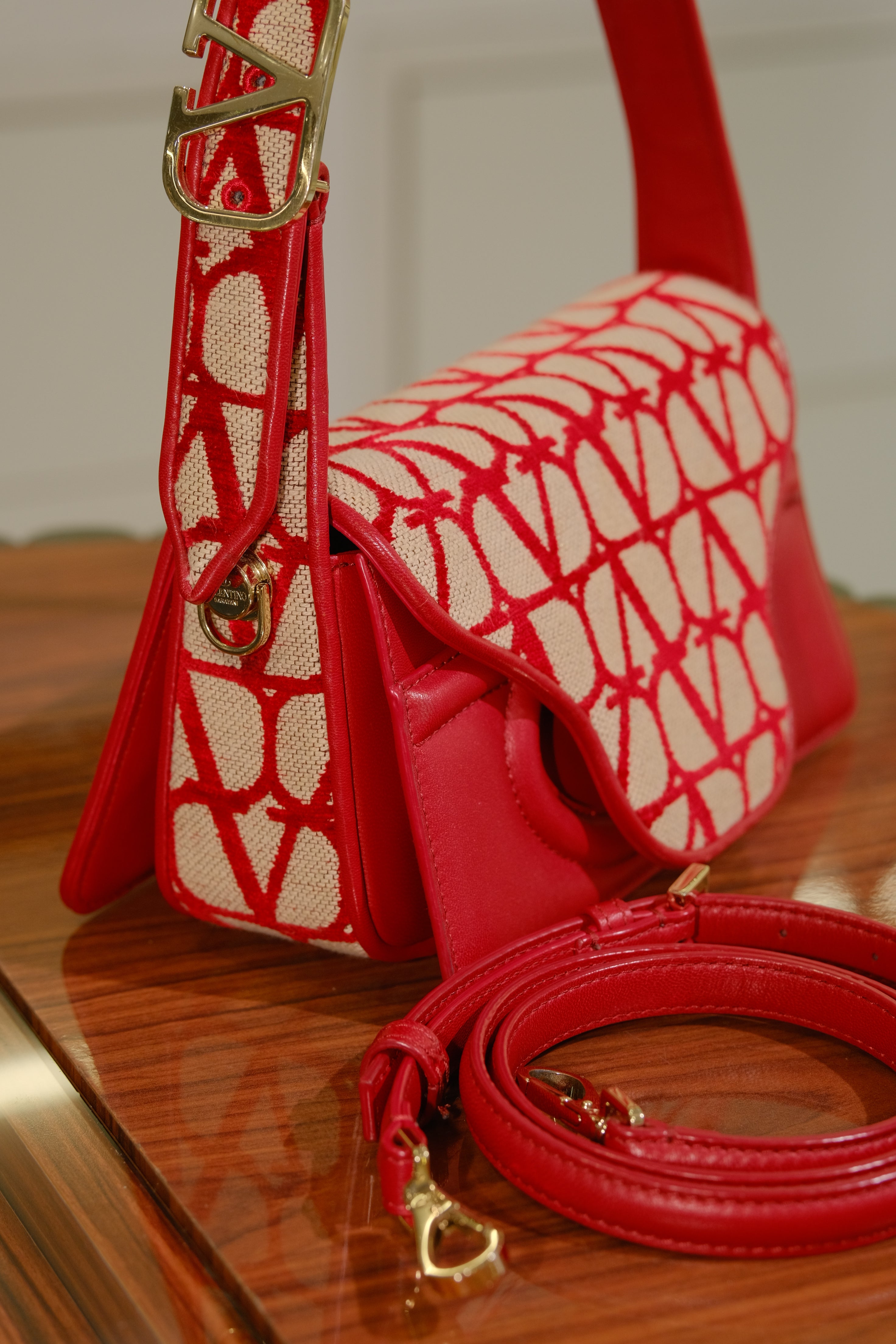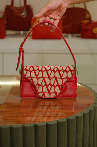Bolsa Valentino Garavani Deuxième, em couro vermelho com detalhe na aba e na parte de trás, ferragem em dourado e aba frontal com fecho magnético.